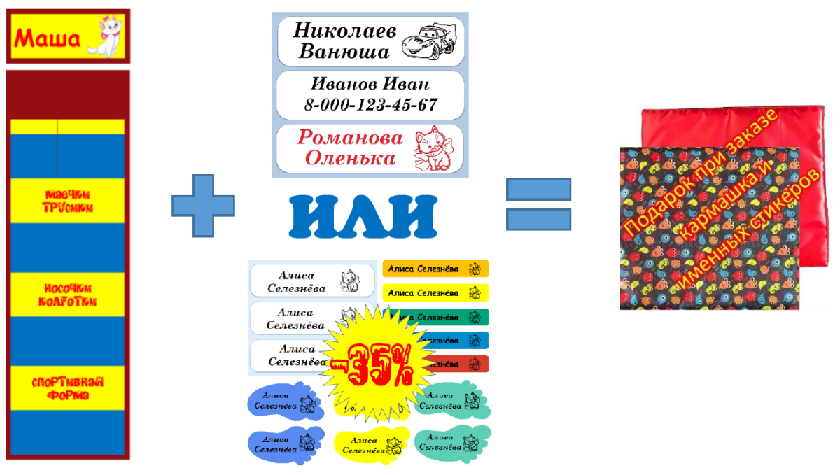 При покупке комплекта кармашек (кроме "Эконом") и стикер для одежды (или набор стикеров)